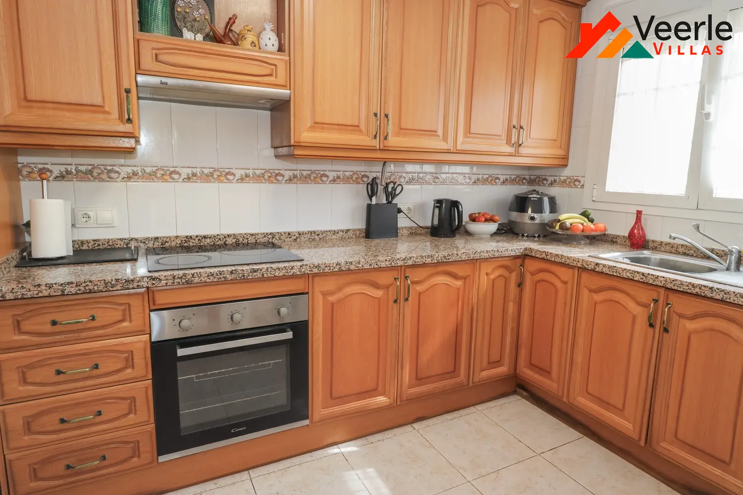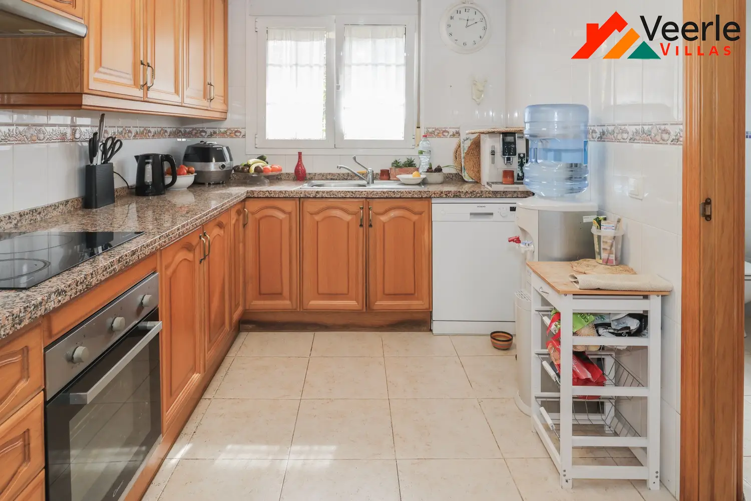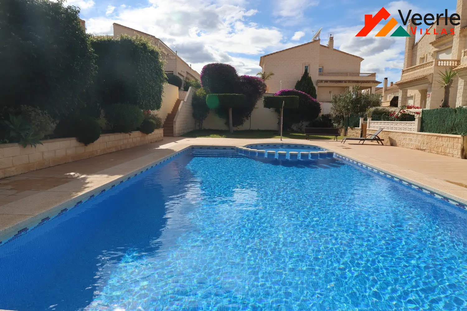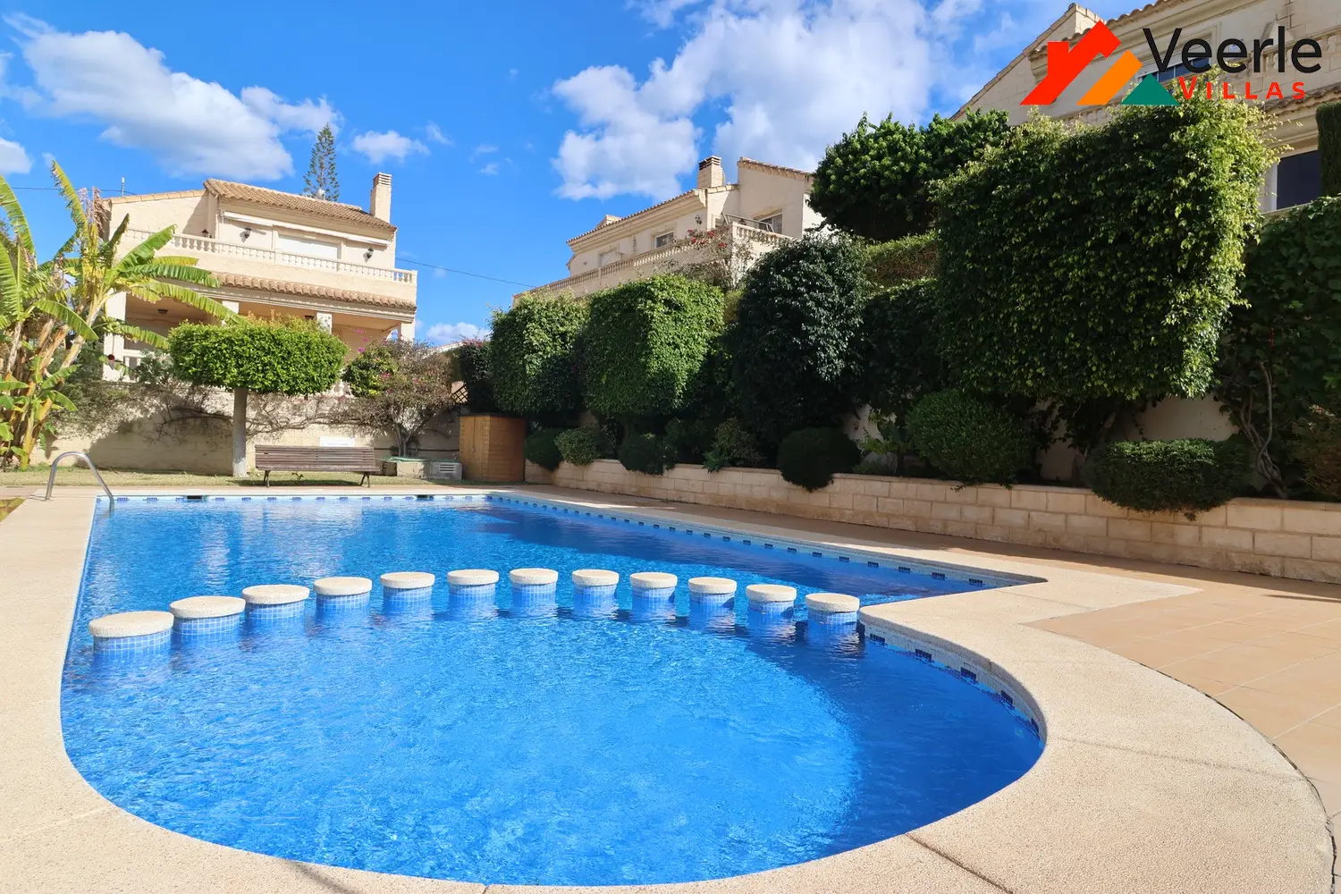 Desde la calle se accede directamente a la casa sin tener que entrar en el complejo. En la entrada de la parcela hay un pequeño jardín con árboles frutales y plaza de aparcamiento para un coche, además hay una plaza de aparcamiento en el garaje, donde también está la lavandería. Por el recibidor se accede a la cocina semiabierta equipada, que también comunica con el gran salón-comedor o directamente al salón con su acceso al espacioso porche y jardín posterior.Desde aquí se accede directamente a la piscina para disfrutar del sol todo el día. En la misma planta hay un pequeño cuarto de baño con ducha.