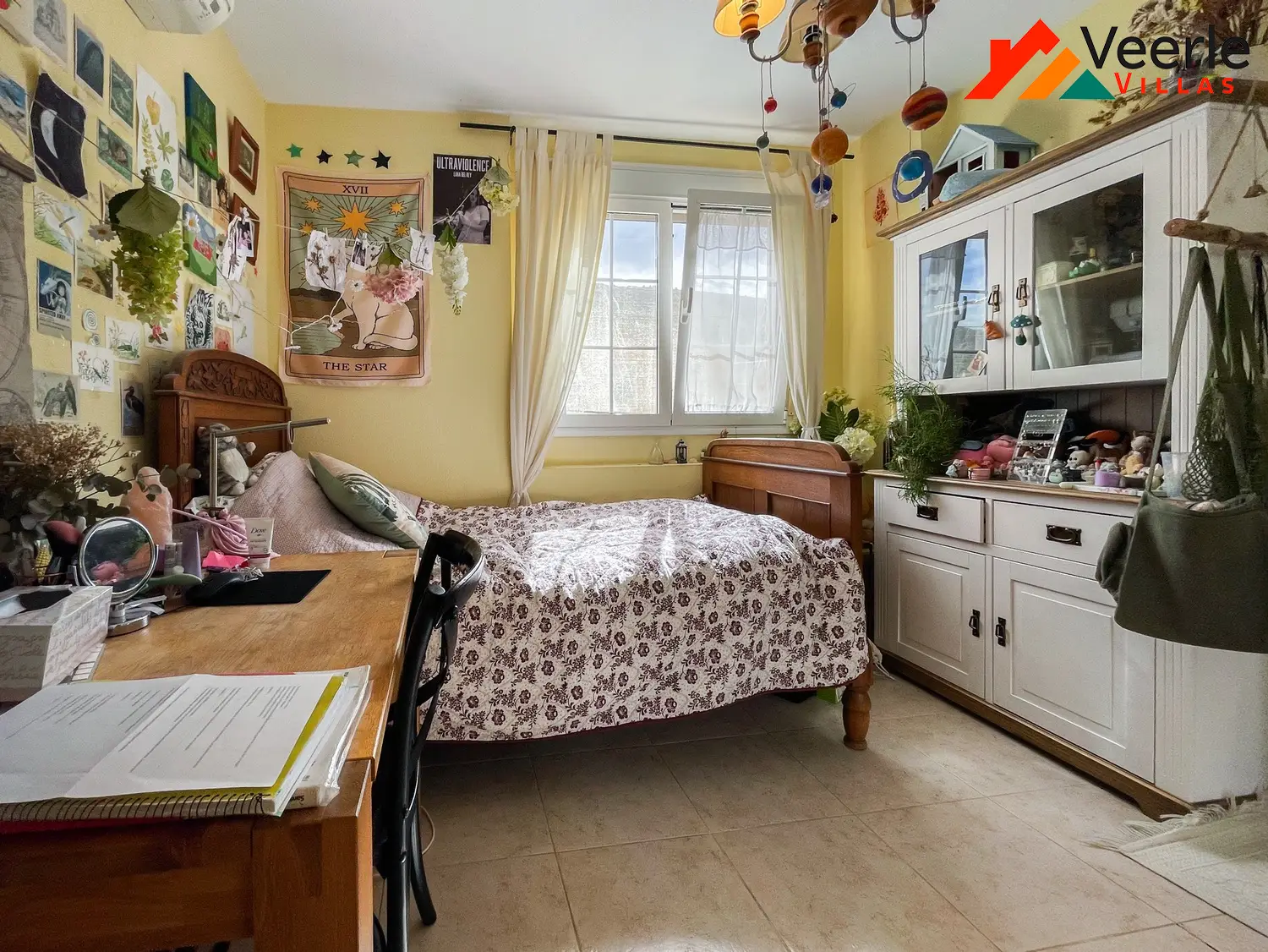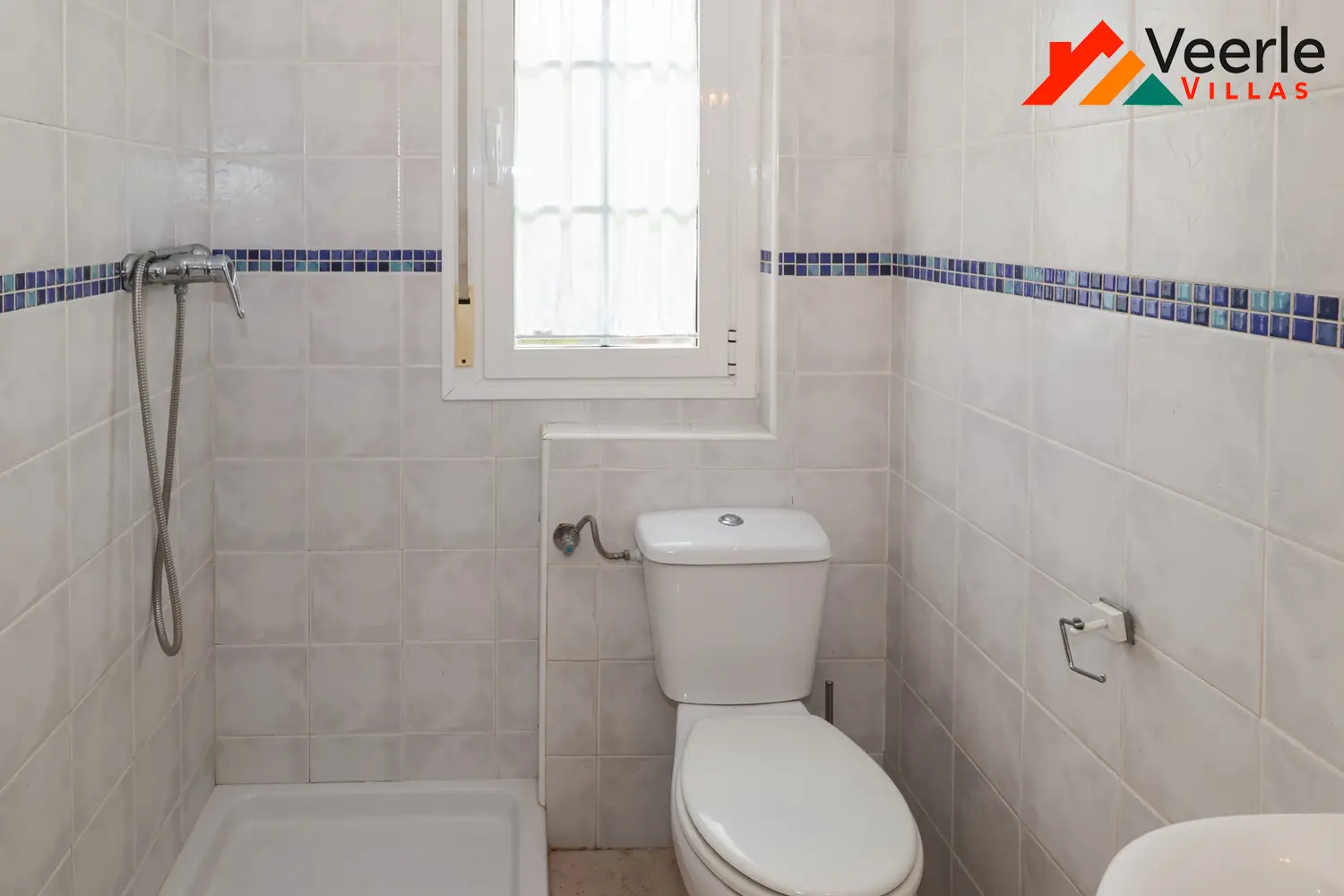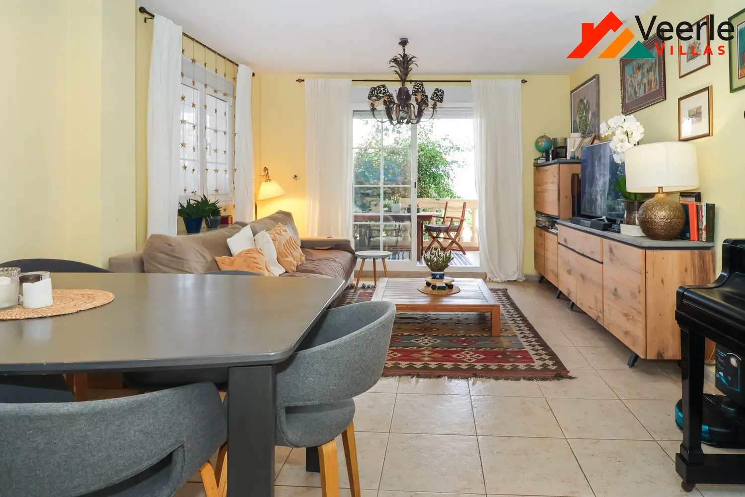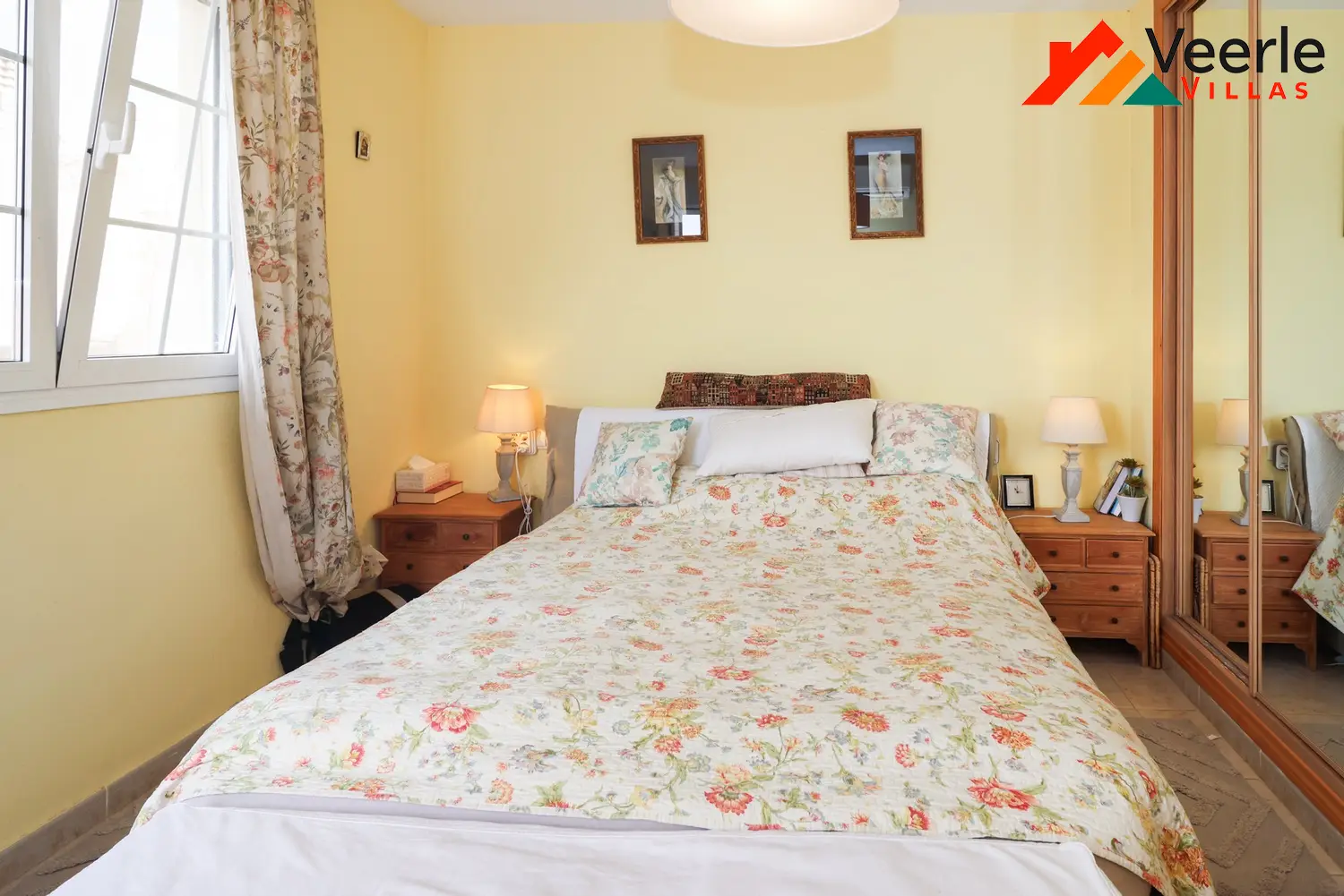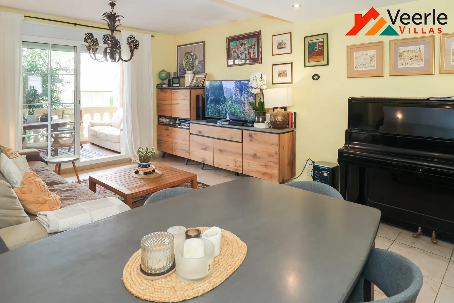 Desde la calle se accede directamente a la casa sin tener que entrar en el complejo. En la entrada de la parcela hay un pequeño jardín con árboles frutales y plaza de aparcamiento para un coche, además hay una plaza de aparcamiento en el garaje, donde también está la lavandería. Por el recibidor se accede a la cocina semiabierta equipada, que también comunica con el gran salón-comedor o directamente al salón con su acceso al espacioso porche y jardín posterior.Desde aquí se accede directamente a la piscina para disfrutar del sol todo el día. En la misma planta hay un pequeño cuarto de baño con ducha.